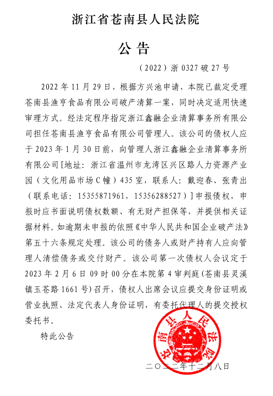 苍南县渔亨食品有限公司破产清算案公告