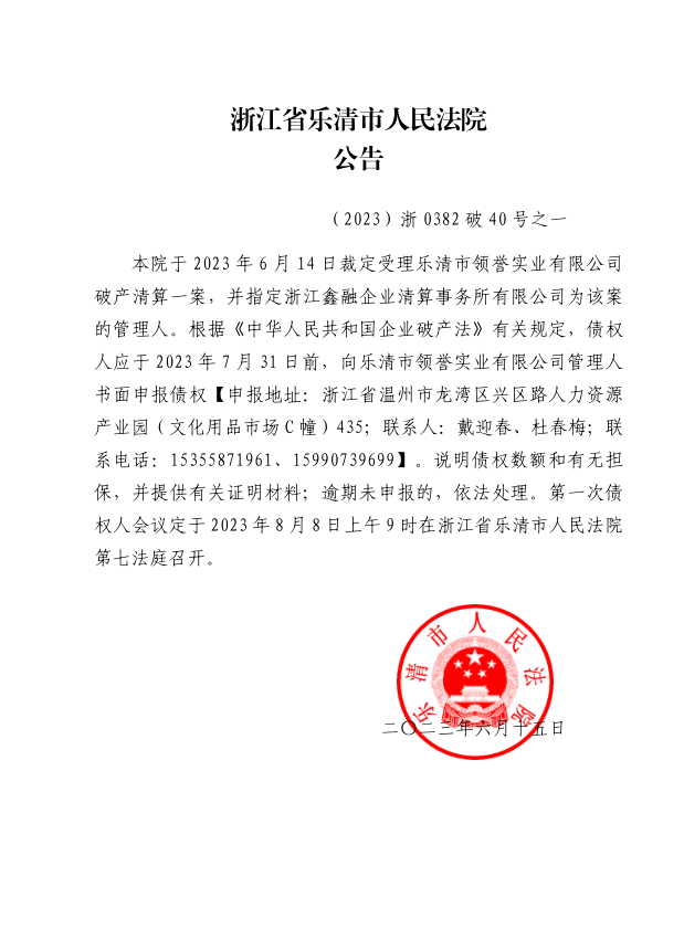 乐清市领誉实业有限公司破产清算案公告