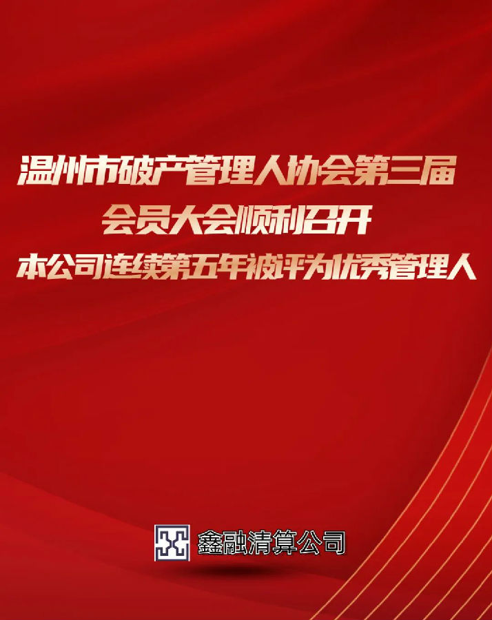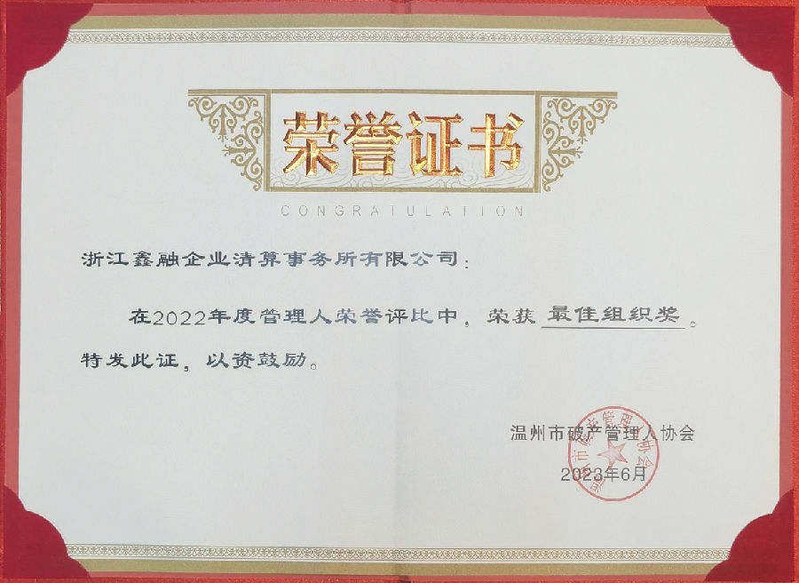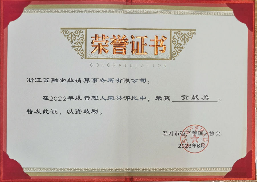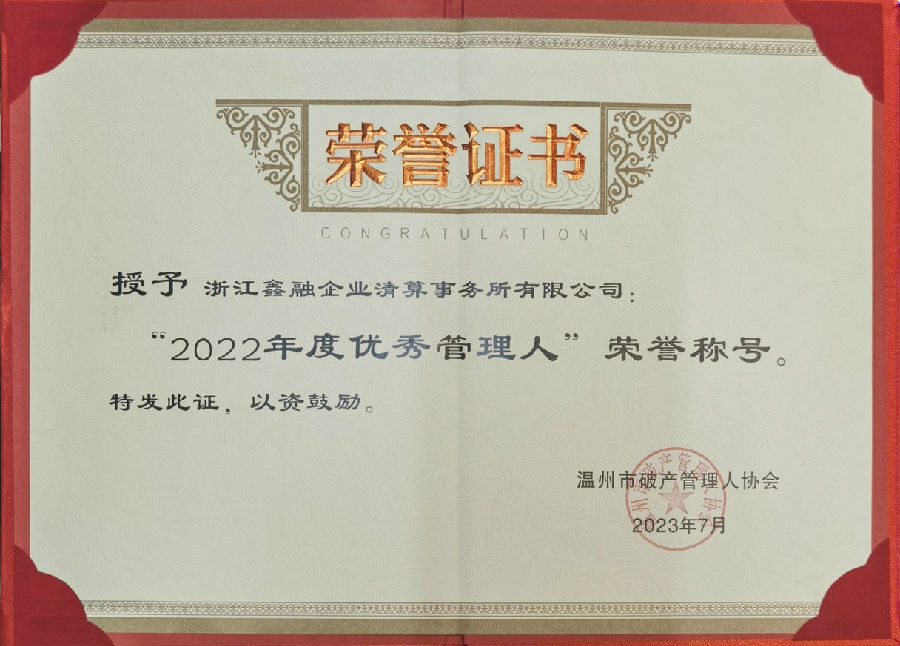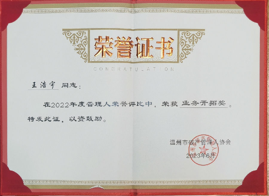 本公司王浩宇总经理在大会中当选温州市破产管理人协会副会长,同时本公司在2022年度中荣获年度贡献奖、最佳组织奖、总经理王浩宇荣获业务开拓奖。本公司连续五年在温州市中级人民法院组织的管理人履职评价中被评为“年度优秀管理人”。鑫融全公司将珍惜荣誉,永葆初心,继续砥砺前进!