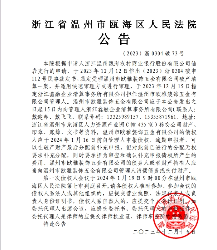 温州市欧雅装饰五金有限公司破产清算案公告
