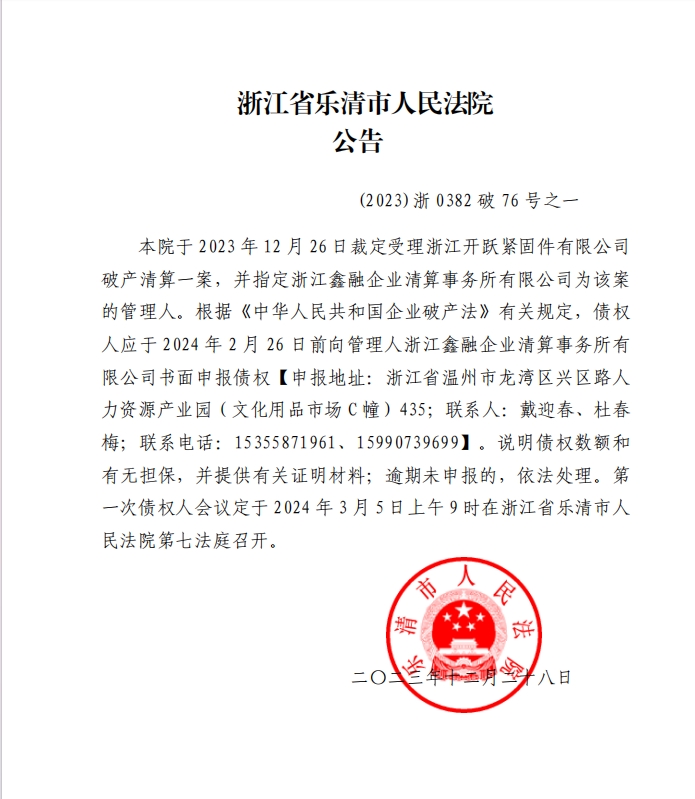 浙江开跃紧固件有限公司 破产清算公告