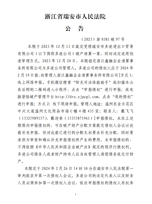 瑞安市多凌进出口贸易 有限公司破产清算公告