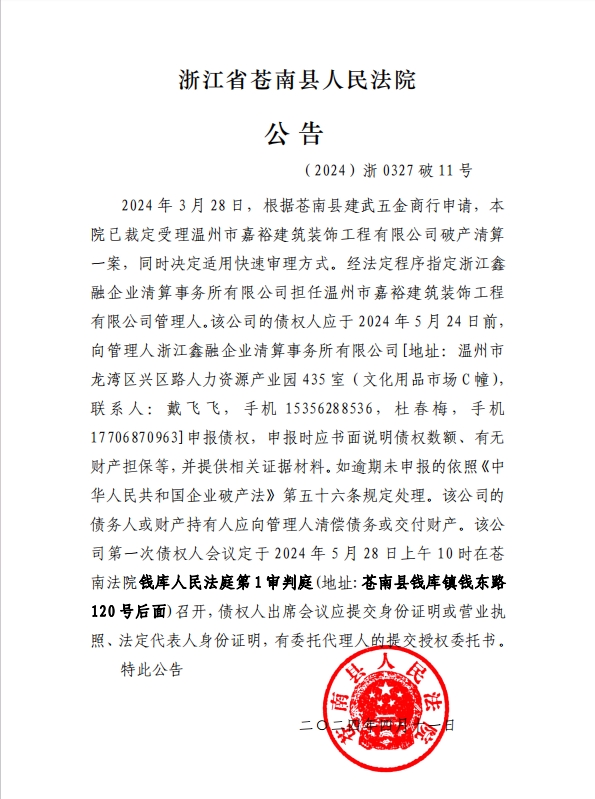 温州市嘉裕建筑装饰工程有限公司破产清算公告
