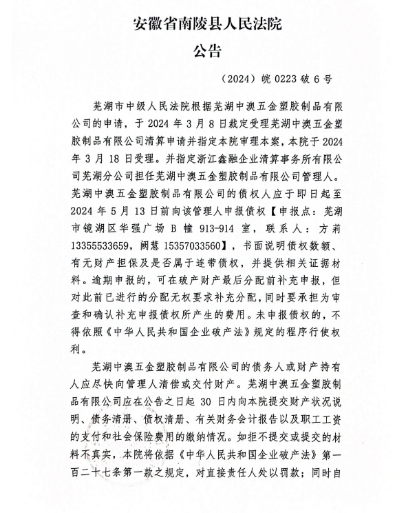 芜湖中澳五金塑胶制品有限公司破产清算案公告