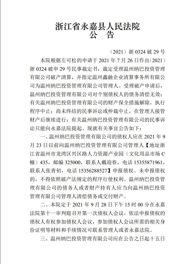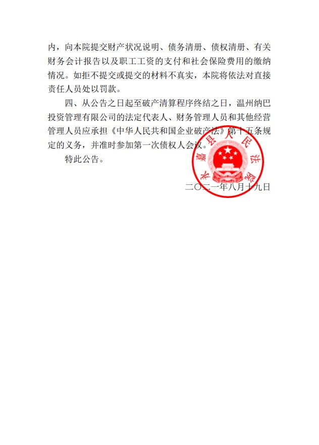 温州纳巴投资管理有限公司破产清算案公告