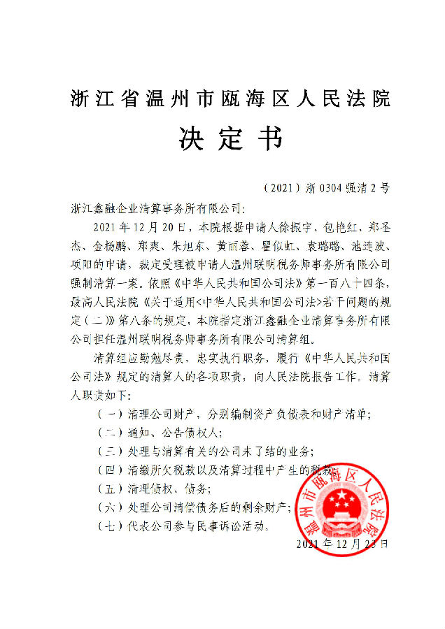 温州联明税务师事务所有限公司强制清算案决定书
